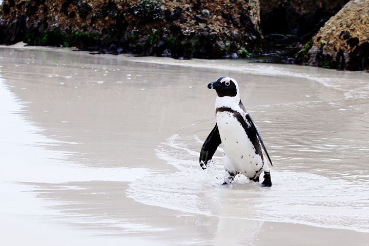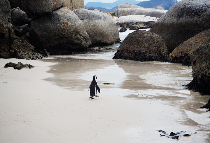 Man liest oft, dass die Kolonie der Pinguine am Boulders Beach sehr klein, die Aussichtsplattform und der Strand selbst touristisch vollkommen überlaufen seien. Jetzt mag es daran liegen, dass ich nicht während der Hauptsaison und außerdem noch vor dem Nachmittag den Strand besuchte – aber das ganze kann ich nicht bestätigen. Von der Aussichtsplattform aus, gab es ausreichend Pinguine zu besichtigen, noch spannender wurde es aber, wenn man den etwas weiteren Weg auf sich nahm und statt zu den Plattformen direkt zum Strand ging. Eine kleine Kletterei und bäuchlings Robben durch den Strand kostet es, aber das Erlebnis ist es wert. Neben den Pinguinen spazieren gehen, mit ihnen schwimmen oder ihnen beim Sonnenbaden zuzuschauen.
