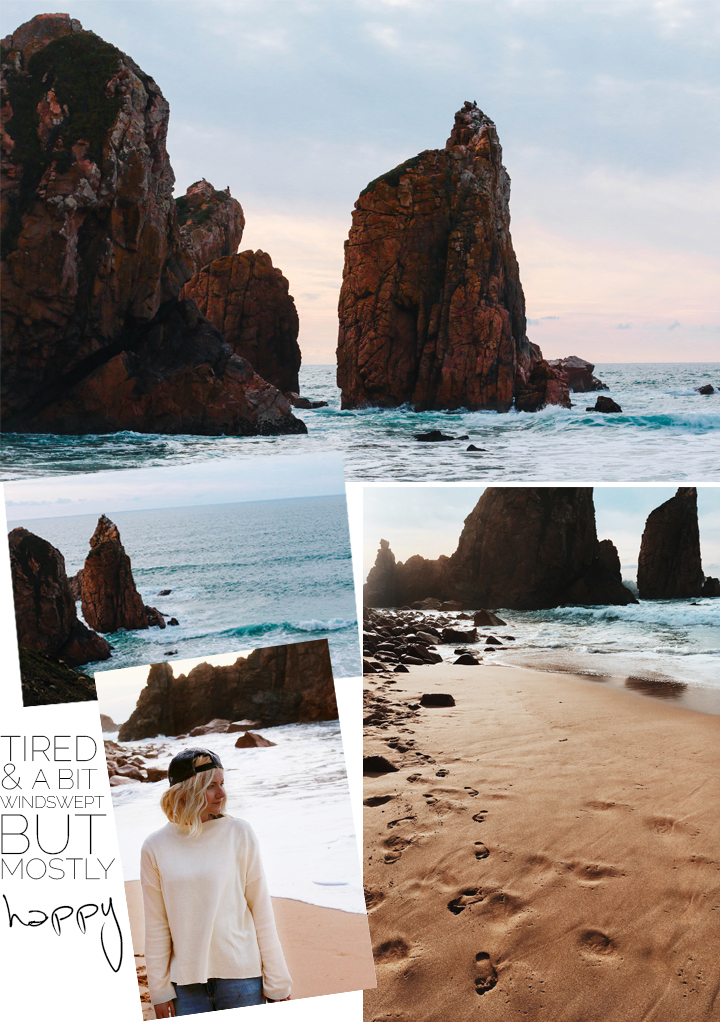 Im Geheimen hatten Anika und ich noch ein anderes Ziel auf der Liste, ebenfalls in der Nähe, allerdings weniger leicht zu erreichen, als die Innenstadt von Sintra. Dass der Wind gerade so auffrischte und der Himmel sich zuzog, machte die Sache nicht gemütlicher. Schon im letzten Jahr schmachtete ich Nisis Video stundenlang und immer wieder an, denn jener Strand hatte es mir unheimlich angetan. Also lud ich mir ihre detaillierte Wegbeschreibung herunter, fand ohne Umwege das kleine Holzschild, das uns zum praia da ursa leitete und stellte das Auto ab. Zum schönsten Teil, dem eigentlichen Strand, geht es nämlich nur zu Fuß. Nisi schlug in ihrem Post den ganz linken Trampelpfad vor, den wir nahmen und für den wir ziemlich dankbar waren, als wir ein paar Mitstreiter auf der gegenüberliegenden Seite die Klippen hinab klettern und immer wieder schlittern sahen. Trotzdem ist das ganze definitiv ein Abstieg, für den sich feste Schuhe aufdrängen. (Nein, keine Treckingboots,  Chucks reichen vollkommen aus.) Ich bin zwar schon den Lion’s Head in Espadrilles hinaufgeklettert und habe auch überlebt, allerdings kostet der Kampf mit dem Schuhwerk nur unnötig Nerven und Zeit, gerade wenn ihr nicht ganz so geübt seid.