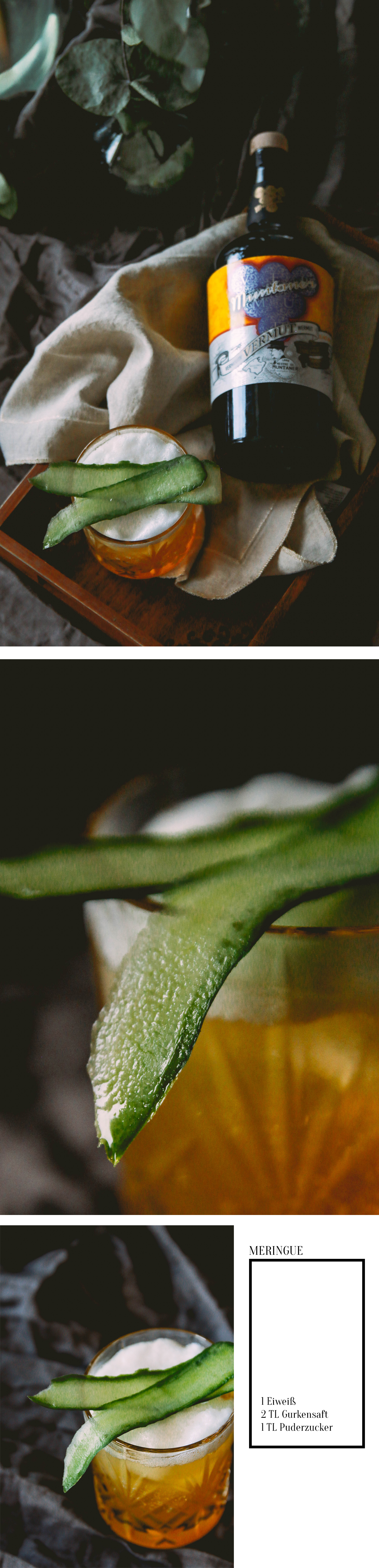 Während man ihn natürlich auch einfach mit gekühltem Tonic und ein paar Eiswürfeln aufgießen kann, habe ich einen anderen Drink probiert, den ich viel spannenderund sogar noch leichter und erfrischender finde: Mutaner Vermuth mit weißem Tee und Gurkenmerinque.